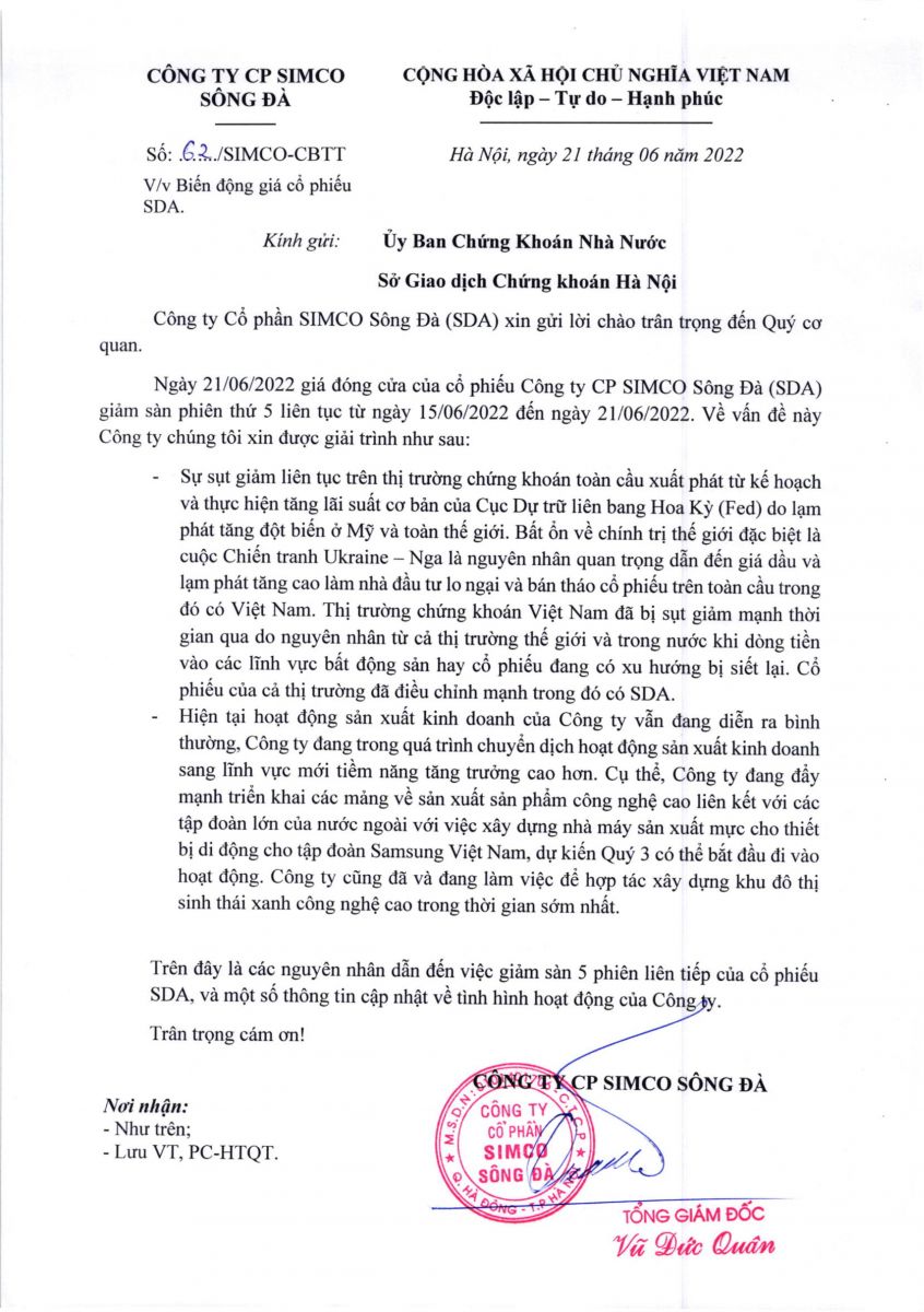 Giải trình về việc cổ phiếu SDA giảm sàn 5 phiên liên tiếp